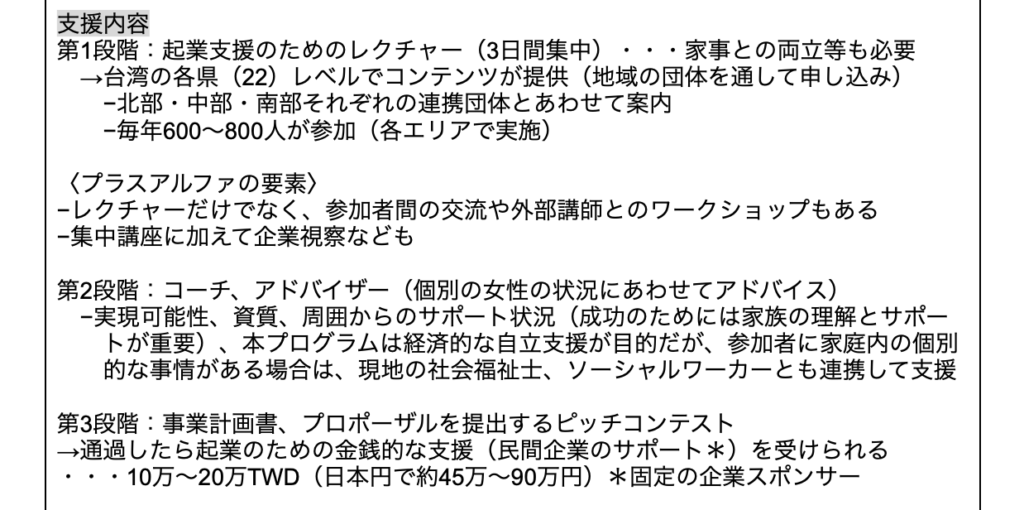 プログラムを運営する過程で、移民に限らず多くの恵まれない女性が同様に緊急の起業ニーズを抱えていることに気づいたため、2020年に台湾の女性も含め、「新・女性起業加速プログラム」と改名し、より多様な女性起業プラットフォームを構築し、それによって台湾の女性の経済力を全体的に高めることを目指していると伺いました。