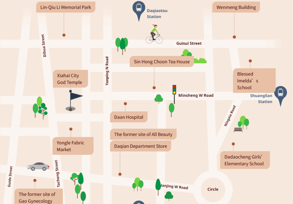 プロジェクト(ツアー企画)は、台北市の大稲埕(だいとうてい)エリア*から始まり、現在は22のうち15の都市まで拡大しているとのこと。*清代末期から日本時代にかけて水運により繁栄した貿易の街。清代に淡水河の沿岸に広がっていた稲を干す広場「埕」に由来する地名。台北市で最も古い市街地の一つ。