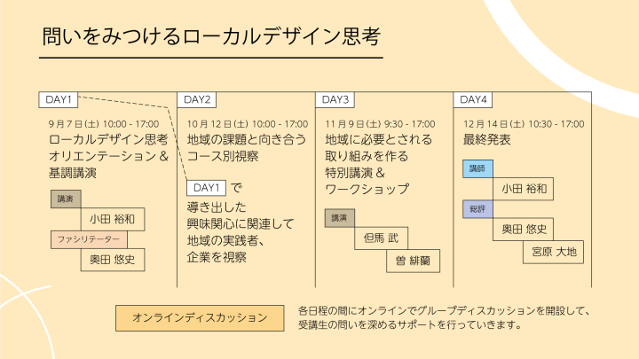 2024年度のアカデミーでは、問いを見つける「ローカルデザイン思考」のオリエンテーションや講義から始まり、コース別フィールドワークを行った上で、地域に必要とされるアイデアを生み出すことが求められています。(下図参照)