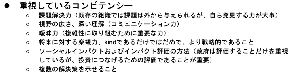 ・試験の点数ではなく、リアルな社会課題に対して自分自身で考える力を重視しているため、①ロジカルシンキング(社会課題の発見、解決策の発案)②デザインシンキング (質問力、議論、クリエイティブアイディア)③社会的企業との接点(企業の課題を一緒に考える機会、パイロットプロジェクト)が大事だと考えている。③については、コーチやメンターという形で社会起業家に関わってもらったり、実際のプロジェクト現場の中で実験したり、また、学生同士のネットワークも大事にしている。